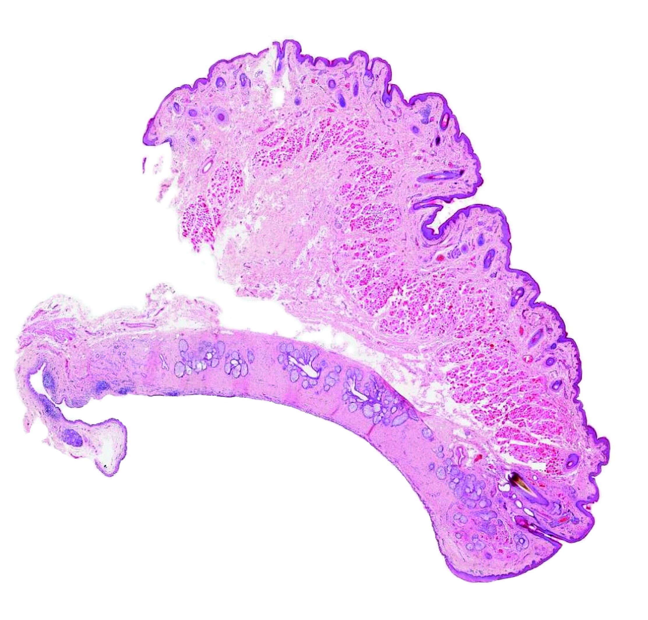 ORIENTATION IN THE SLIDE On a transverse section of the upper eyelid, two distinct surfaces can be recognised: the skin covers the outer surface, while the inner surface facing the eye is covered by the conjunctiva (marked by the green line). The slide presented here was scanned for the Virtual Atlas and can be viewed in detail in our collection of virtual slides via SmartZoom software. The eyelid contains a rigid connective tarsal plate (yellow) of dense connective tissue near the inner surface, which houses the Meibomian gland. At the upper edge, the smooth muscle (orange) attaches to the tarsus. The conjunctiva near the conjunctival sac contains numerous lymphoid follicles (purple), and occasionally the slide contains an accessory lacrimal gland (blue). In the slide above, the tarsus is artificially detached from the orbicularis oculi muscle (red). A dense connective tissue attached to the tarsus includes the tendon of levator palpebrae muscle (whose muscle tissue is not seen in the slide). Outer surface of the eyelid is covered by a thinly keratinized epidermis, dermis (with dermal adnexa) and hypoderm (subcutis). On the lower margin of the eyelid, the eyelashes (or their large hair follicles) are clearly visible, to which the ciliary glands (Zeiss and Moll's) are attached. Fig. 2. Interactive slide of the eyelid: Survey. Move the cursor over the image to show the basic structures of the slide in a different colour scheme. The legend is given in the text above. Author of microphotography: J. Mokrý. |
