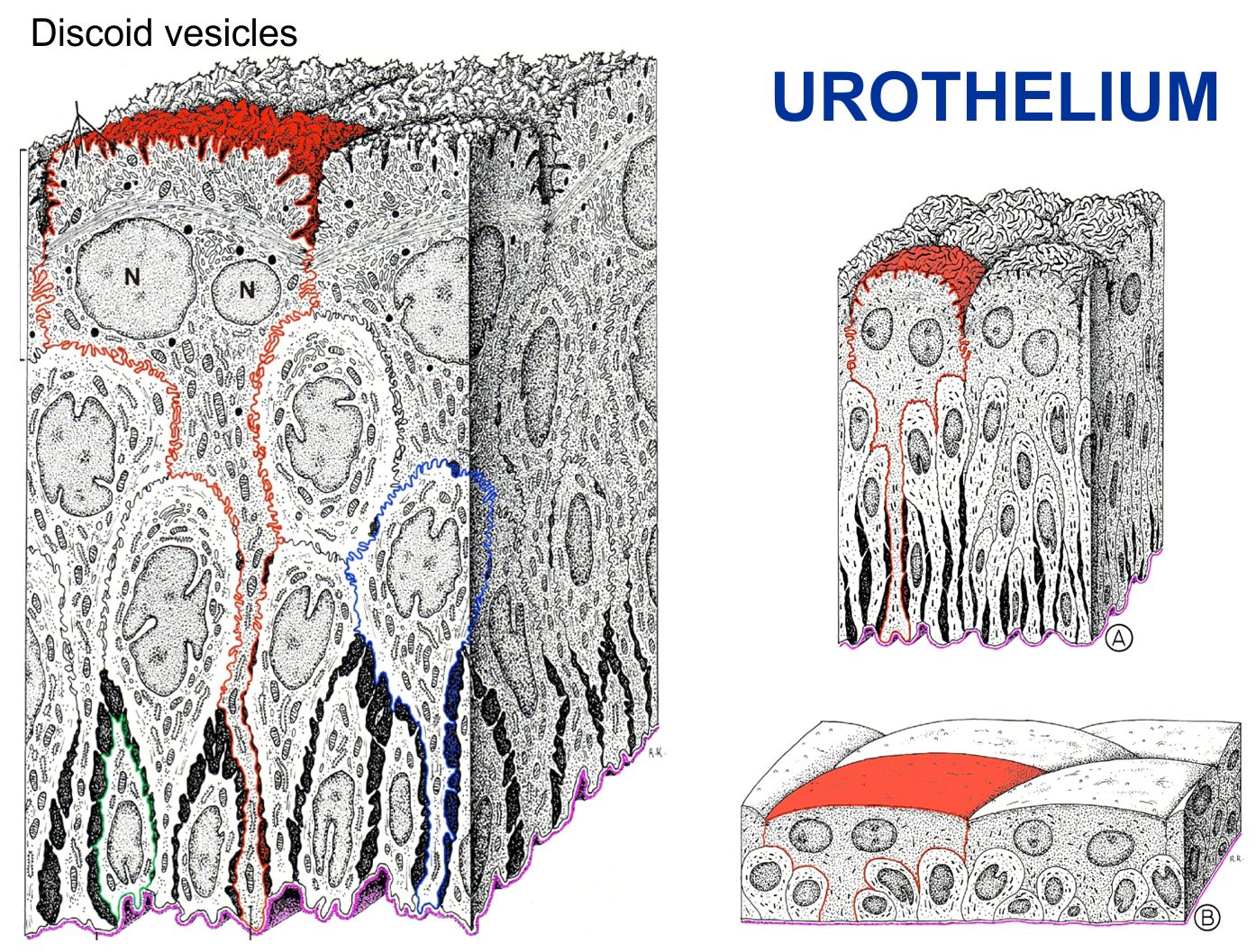 The mucosa is lined with the urothelium (classified as a pseudostratified cuboidal epithelium). This epithelium is also called as the transitory epithelium because its structure changes according to its content: an empty bladder has 6-8 cell rows while a full one has only 2-3 cell rows. The lamina propria mucosae under the basal lamina is formed by a loose connective tissue and permits to form mucosal folds. A smooth mucosa in the trigonum vesicae facilitates removal of urine into the urethra.