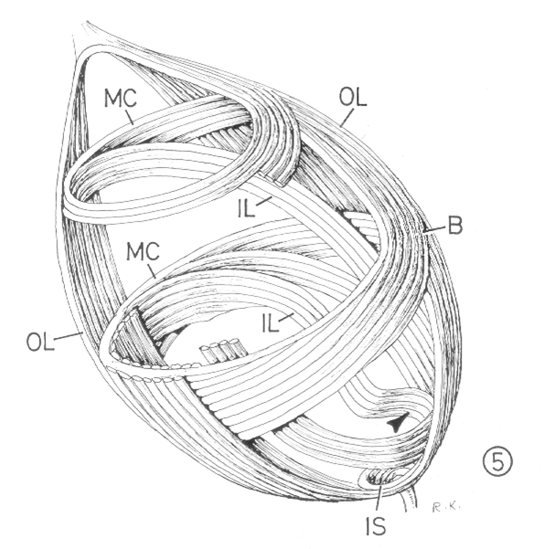 The t. muscularis consists of a smooth muscle, which is arranged in three layers: an inner layer is plexiform, middle circular (the thickest part constitutes the musculus sphincter vesicae) and outer is longitudinal. A musculature of all three layers functions as the musculus detrusor, i.e. it is important in emptying the bladder.