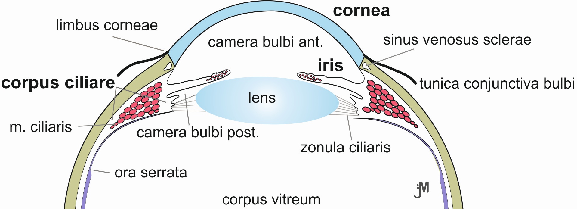 The eye is the most important sensory organ that conveys our vision. Through the eye, we perceive the image of the surrounding world through light that is projected onto the light-sensitive retina. In terms of its structure, the eye is the most complex sensory organ. The wall of the eyeball is made up of three concentric layers. The outer layer, the fibrous coat, differentiates into the sclera and cornea. The middle layer of the eyeball wall is the vascular coat (uvea). Uvea comprises three components - the choroid, the ciliary body, and the iris. Uvea is a layer composed of loose connective tissue containing numerous blood vessels and melanocytes. The pigment cells, together with the retinal pigment epithelium, form a black chamber inside the eye that prevents light reflection. In the inner layer of the eyeball, the nervous coat, lies the retina. Its anterior part covering the ciliary body and the posterior surface of the iris is double-layered and forms the blind part of the retina, as it lacks photoreceptors and nervous cells. The optic part of the retina extends from the ora serrata to the papilla of the optic nerve. The optic nerve fibres convey information from the eye to the brain for further processing.